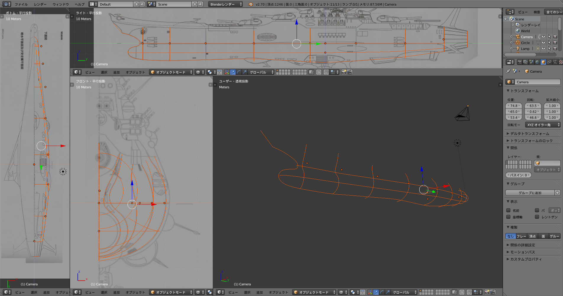 下絵を取り込み、何のプランも無くカーブを使って船体をなぞっています。